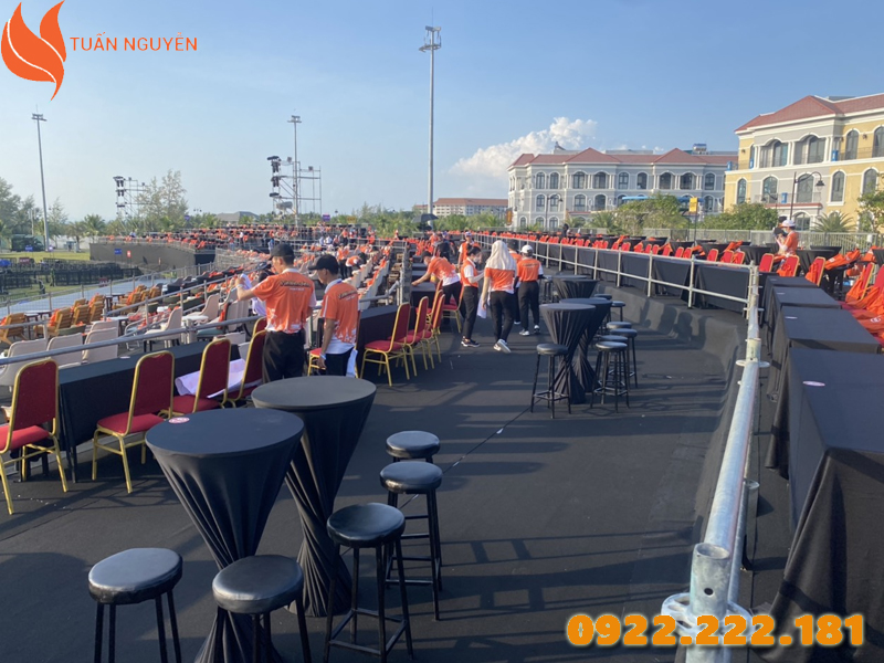 Giá thuê sân khấu ưu đãi, tùy chiều cao và thời gian thuê. Ngoài ra, Tuấn Nguyễn còn hỗ trợ thảm trải sân khấu, cầu thang, tấm ốp hông và dán decal thương hiệu để tạo điểm nhấn riêng cho từng sự kiện.