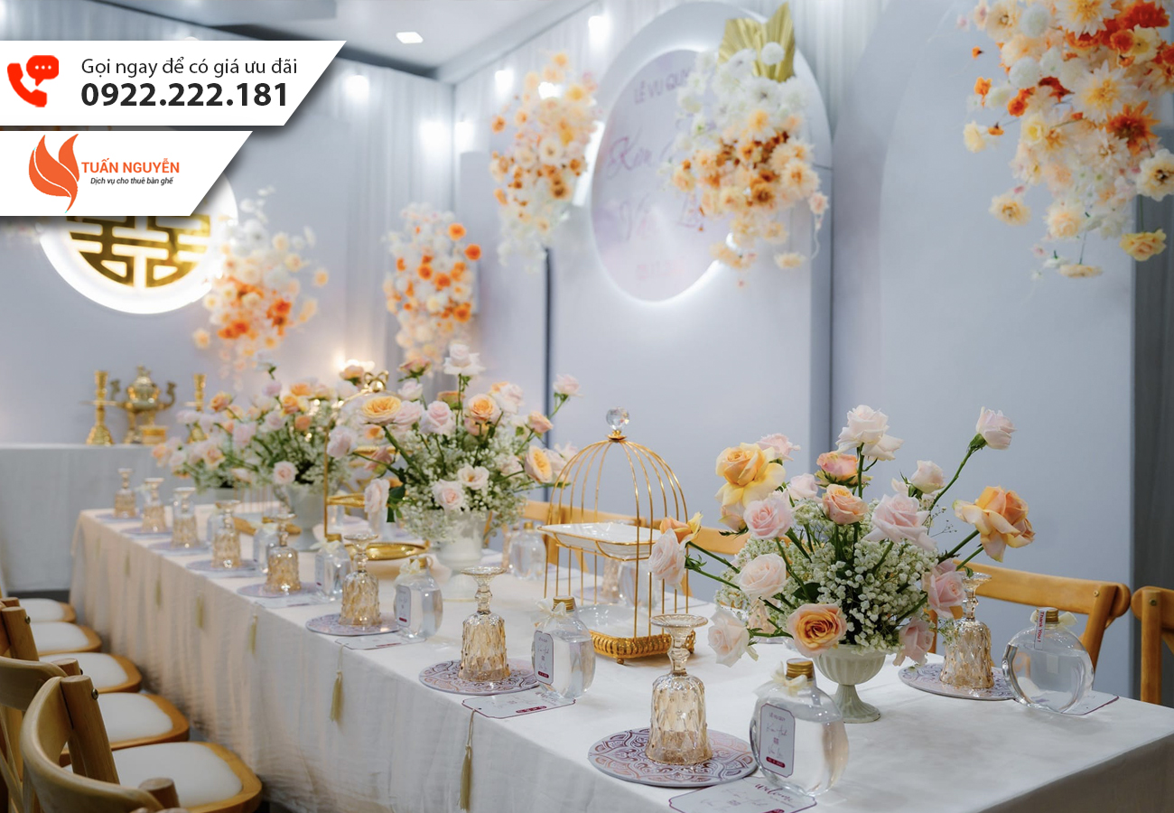 Trong không khí rộn ràng của mùa cưới, việc chuẩn bị một không gian tiệc sang trọng, ấm cúng và chuyên nghiệp luôn là mong muốn của mọi cặp đôi. Và, để góp phần giúp bạn có một ngày trọng đại hoàn hảo hơn, Tuấn Nguyễn chúng tôi mang đến chương trình giảm giá 25% dịch vụ cho thuê ghế Tiffany cùng nhiều ưu đãi hấp dẫn khi cho thuê bàn ghế tiệc cưới, cho thuê khung rạp, cho thuê dụng cụ tiệc.