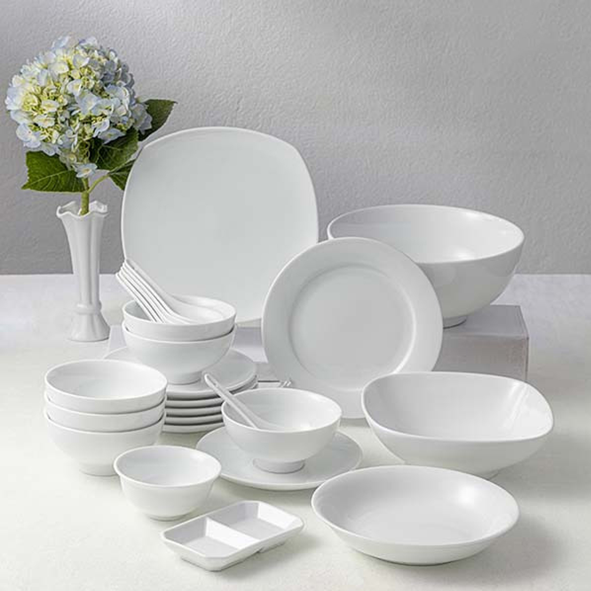 Gốm sứ trắng luôn là lựa chọn hàng đầu cho các bữa tiệc trang trọng. Những bộ chén dĩa gốm sứ trơn, không họa tiết mang đến cảm giác sạch sẽ và hiện đại, phù hợp khi bạn thuê dụng cụ tiệc cho những bữa tiệc quan trọng. Hơn nữa, chúng dễ dàng phối hợp với bất kỳ loại thực phẩm nào.