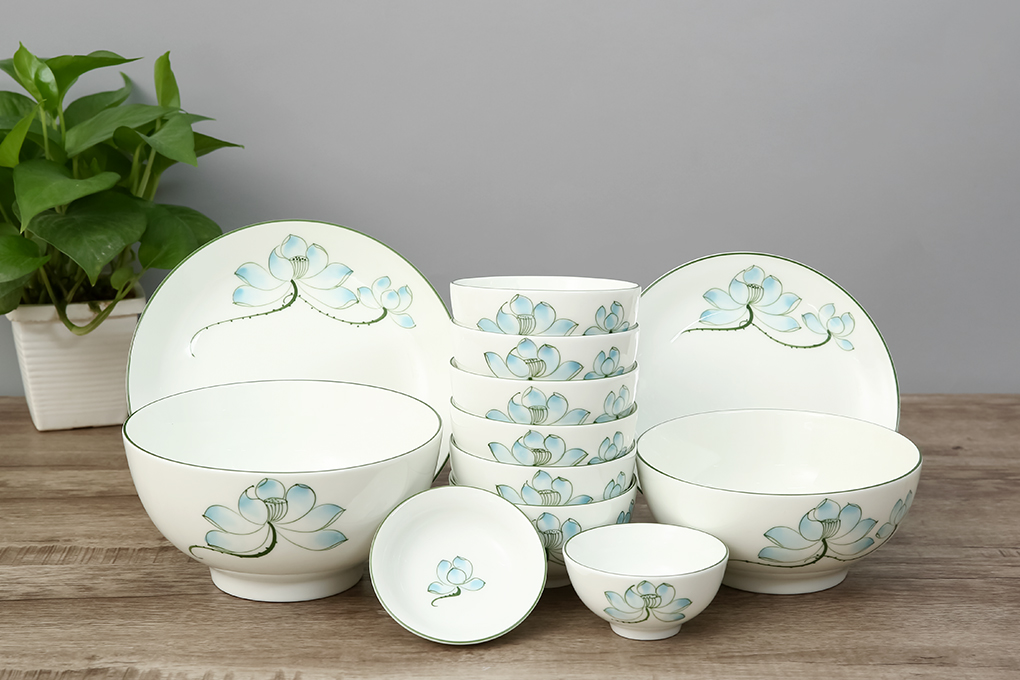 Bộ chén dĩa bằng gốm sứ có họa tiết hoa văn